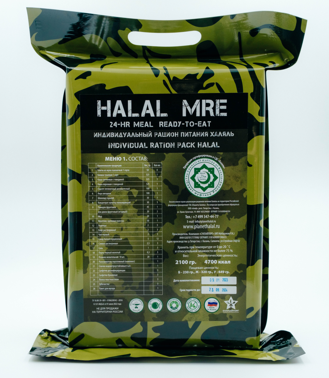 Компания "Сухпайторг" является производителем и поставщиком индивидуальных рационов питания (сухие пайки) стандарта халяль. Сухие пайки халяль под торговой маркой "Сухпайторг" - это вкусные и качественные продукты, соответствующие всем канонам Шариат, для различных категорий людей, со специально подобранным, сбалансированным составом.