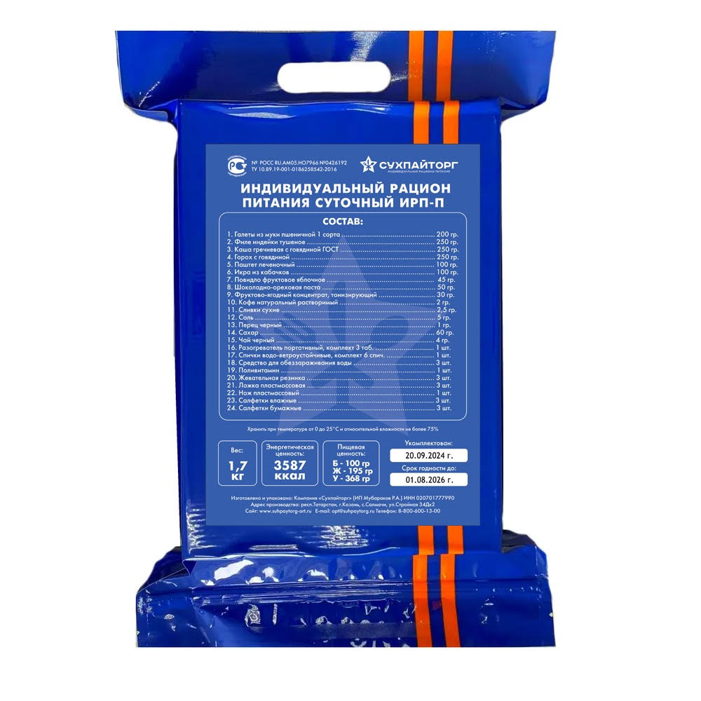 Сухпаек разработан специально для комплектования бомбоубежищ и создания аварийного запаса на предприятии. Рассчитан на сутки питания взрослого человека, три приема пищи: завтрак, обед, ужин. Продукция изготовлена по ГОСТ, высокого качества и вкусная. Рацион питания сбалансирован. Прочная упаковка и низкая стоимость. Большие срок годности - от 22 мес.